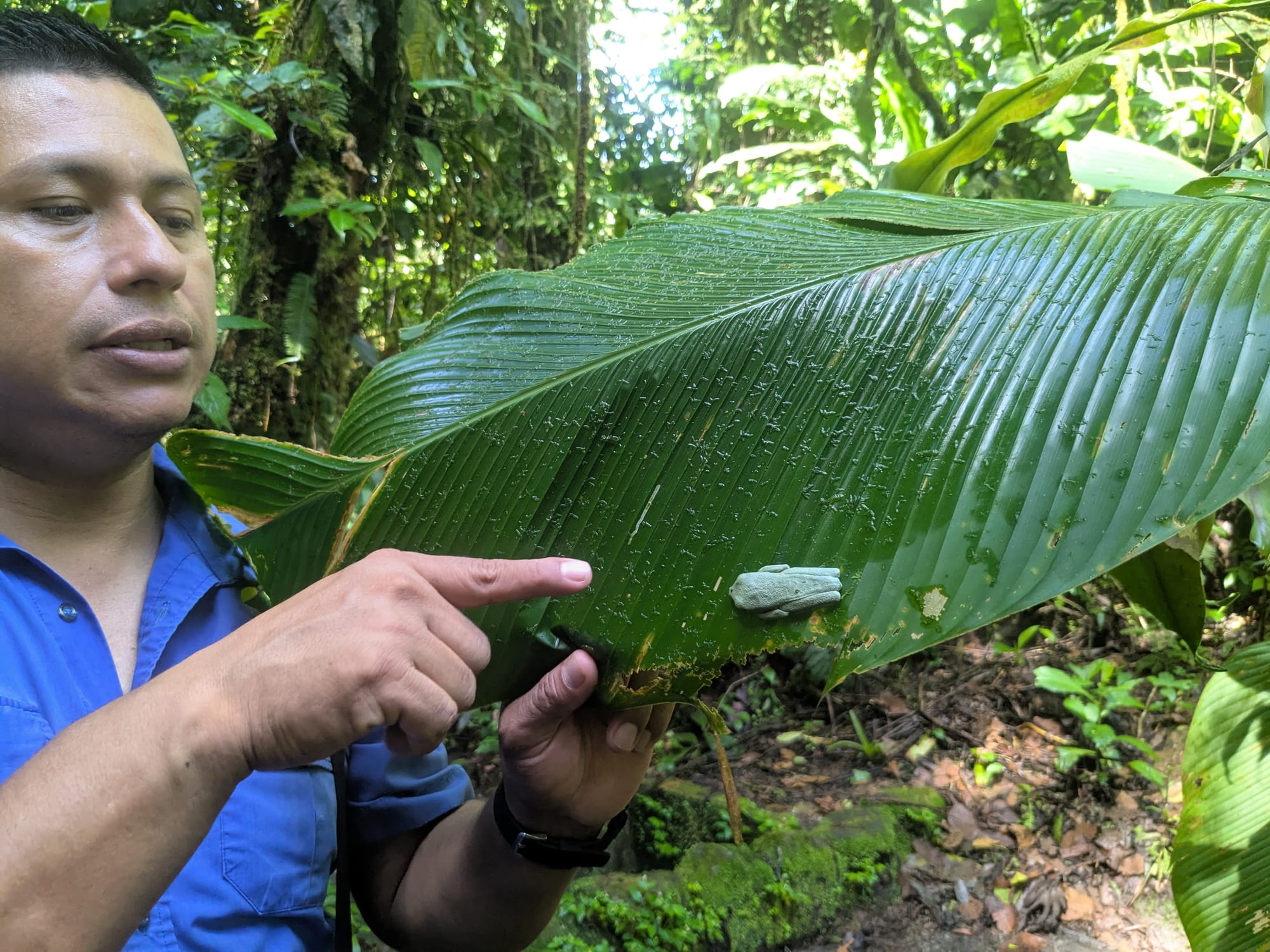 We head down to the frog pond which Christian says is best at night, because the frogs sleep during the day. He's able to point out a few sleeping frogs, usually on the underside of a big leaf, camoflauged. Some times they'll sleep next to their eggs, which is a weird looking clear jelly with tiny eggs in it. Gives you the shivers to look at, to be honest.