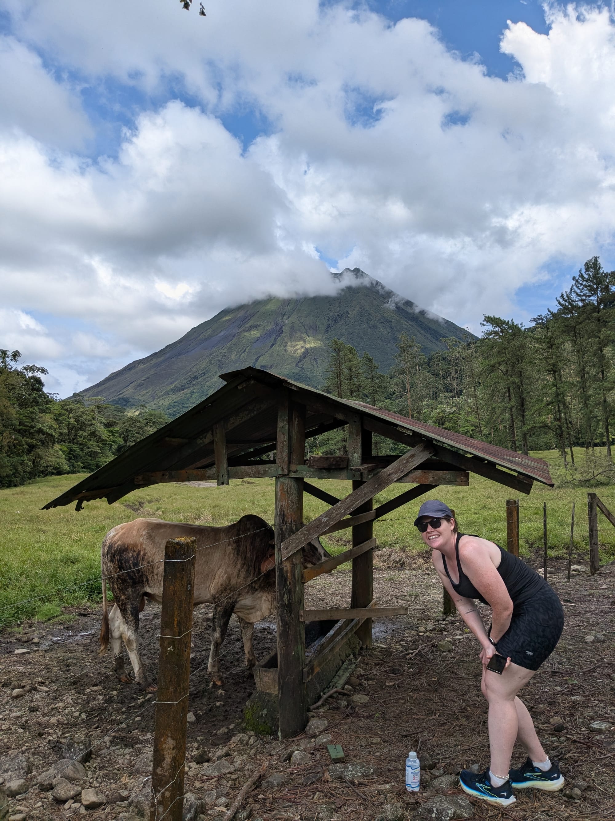 We try our hand at bird spotting after this morning's crash course but only really see hummingbirds, plus a few vultures that are cruising around in the sky! We also chat to the resident cows who are mostly just lounging around. We get to the final, big waterfall and it's lovely. We've been hiking all morning and it's a hot one today so we make our way to the cafe for a quick bite.