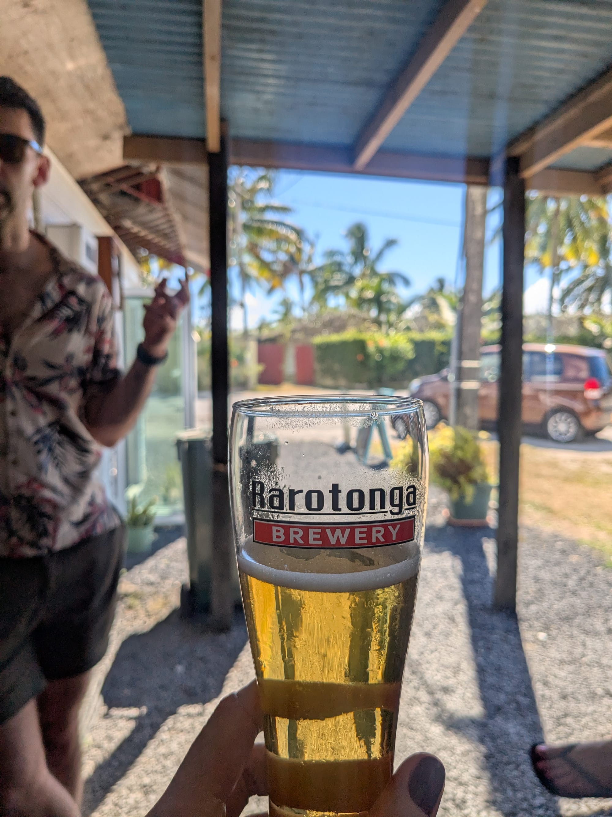 The main road follows pretty close to the beach the whole way around, so it's just non-stop gorgeous views. The tropical mountain side to our right ain't too bad either. We hit the brakes when we see Raratonga Brewey and stop in for a taste. Not bad, but on we go.