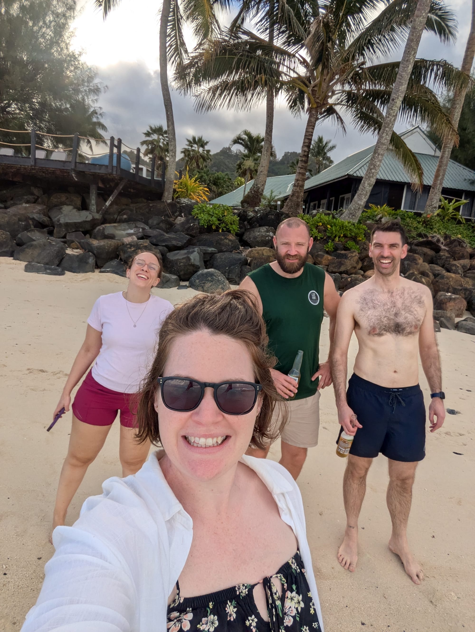 The place is incredible. Beach-front, via the infinity pool, of course. We have 2 big villas between 7 of us. We get the tour then head straight down to the beach. The place comes with snorkels and kayaks and all the fun stuff we're gonna need.