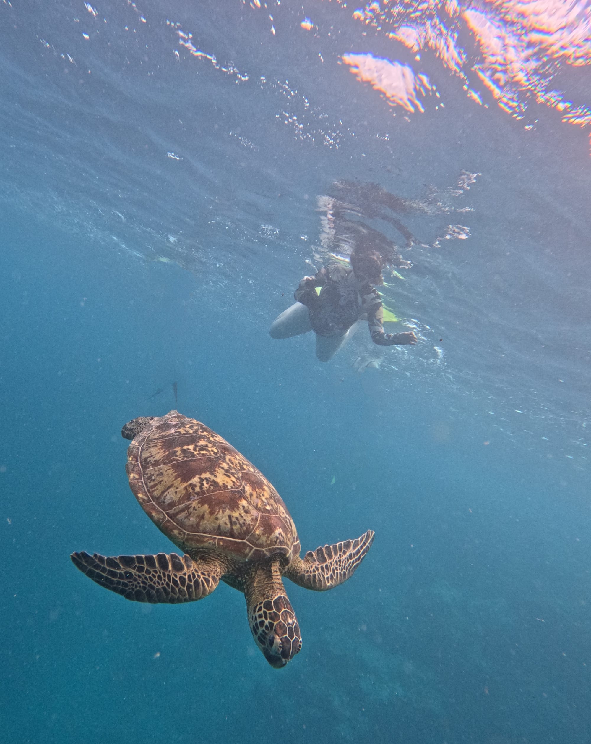 The weather has completely cleared up since yesterday and everyone is making the most of it. There's stacks of people at this snorkelling spot and you can see why. Visibility is great, it's not too windy and there are fish everywhere. We even see a turtle munching on half a coconut shell.