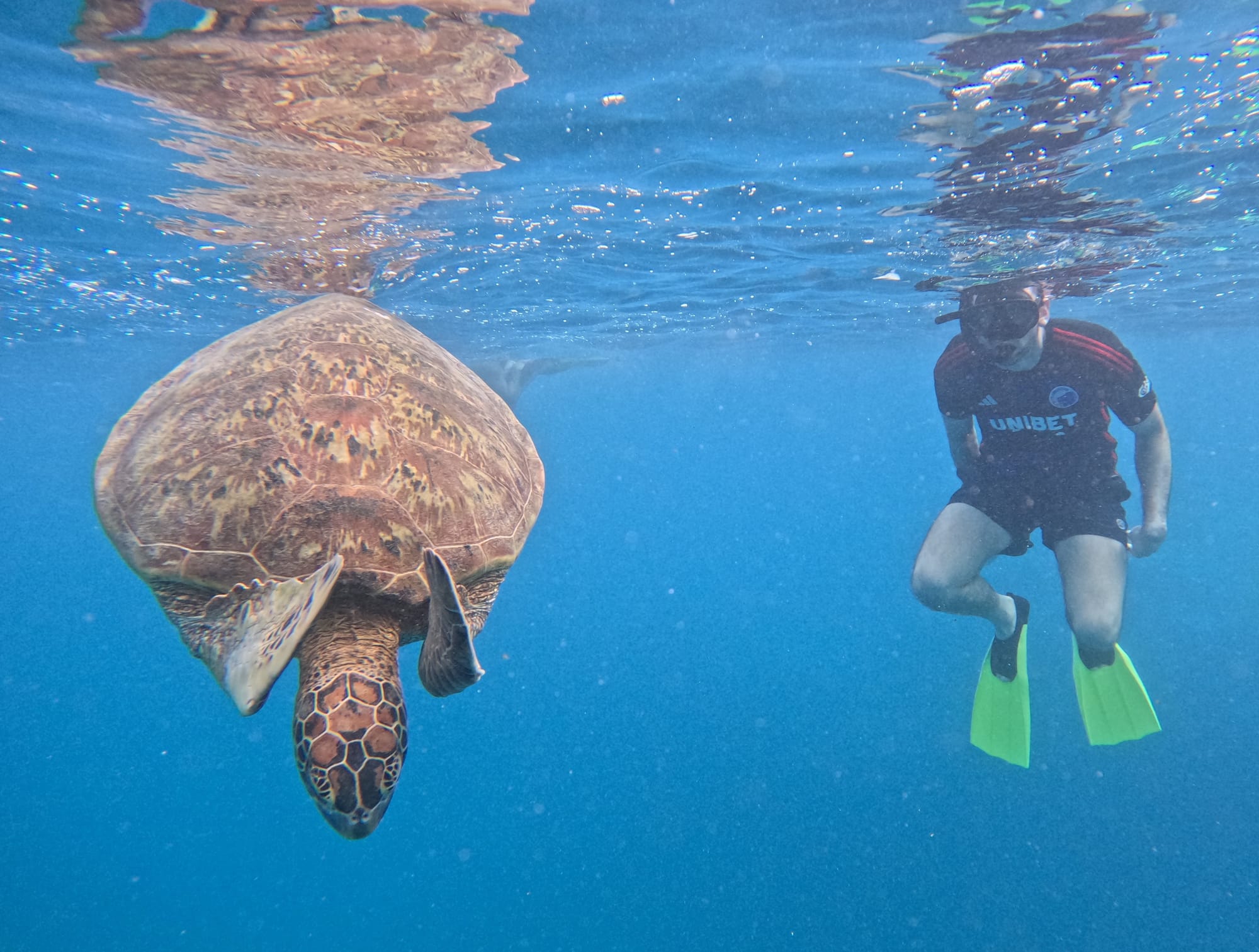 It's back to the house for a little rest and recharge then off to the sea turtle excursion. This was the one that we had to reschedule from the other day due to the weather. Conditions have significantly improved but there's still a bit of a current. We don our snorkel and fins and head into the water. Courts is nervous (as usual) but also because we're going over the passage that's 25 meters deep and you can't see or touch the bottom. The fins help and so do the handheld scooters we get to zing around under the water with. Cool.