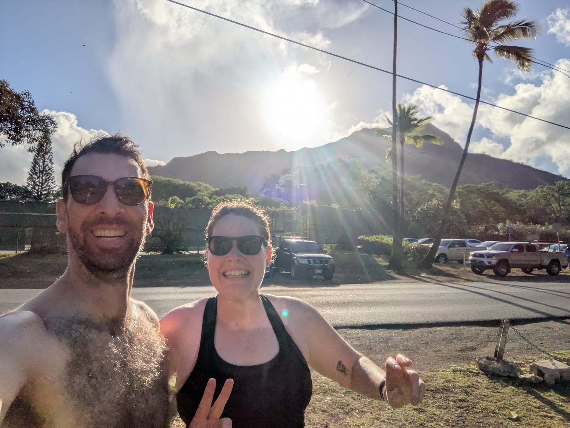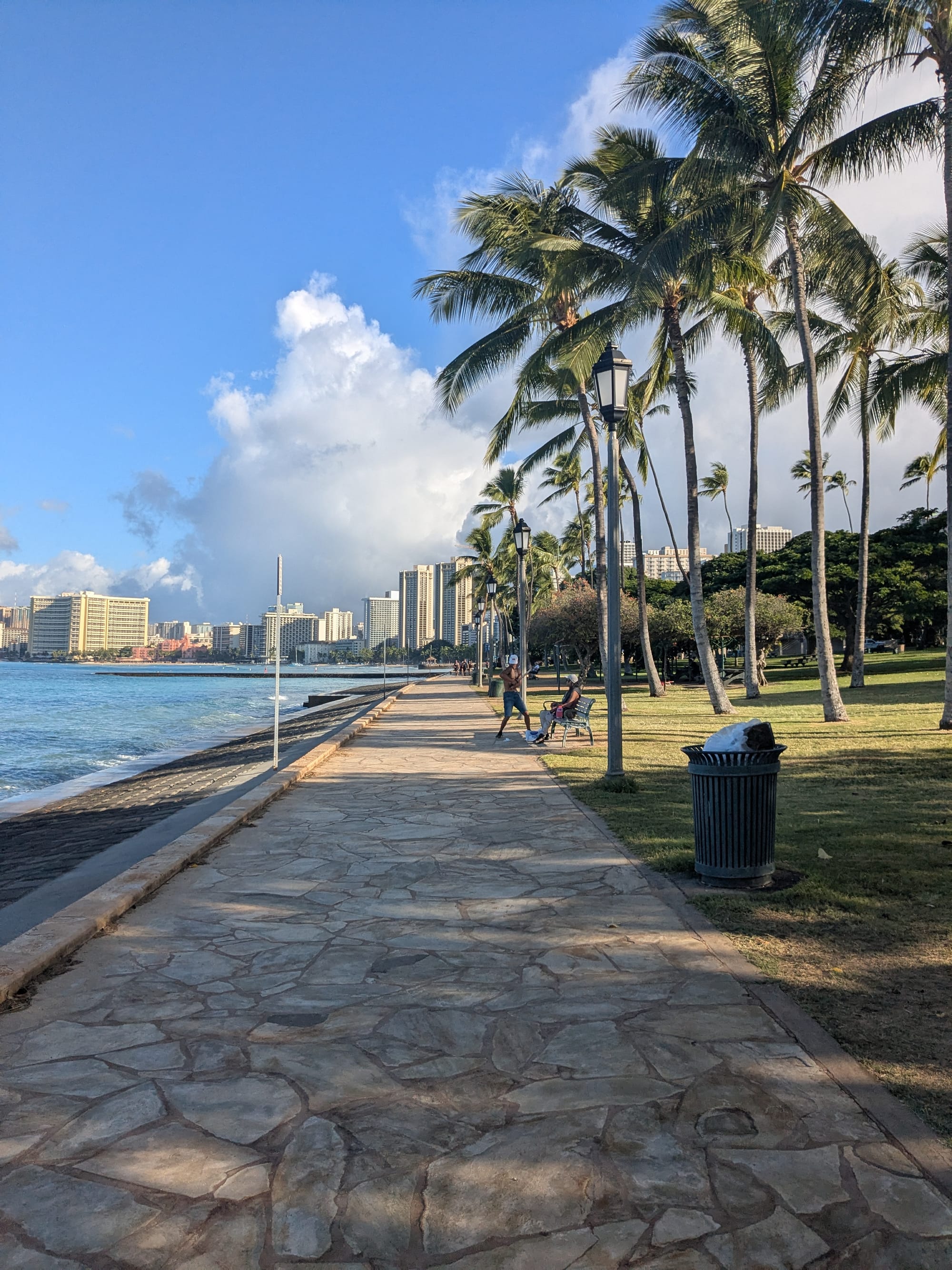 We do a loop of a big park down the east end of Waikiki where the Honolulu zoo is and pass close by the bottom of Diamond Head. We come back via the beach and the views are great. The clientele is a little sketchy though; we have to run by someone practicing their samurai sword technique with a proper sword - the issue is he looks like the kinda guy who's been up all night at that bench practising his technique... It's another "welcome back to America" moment.