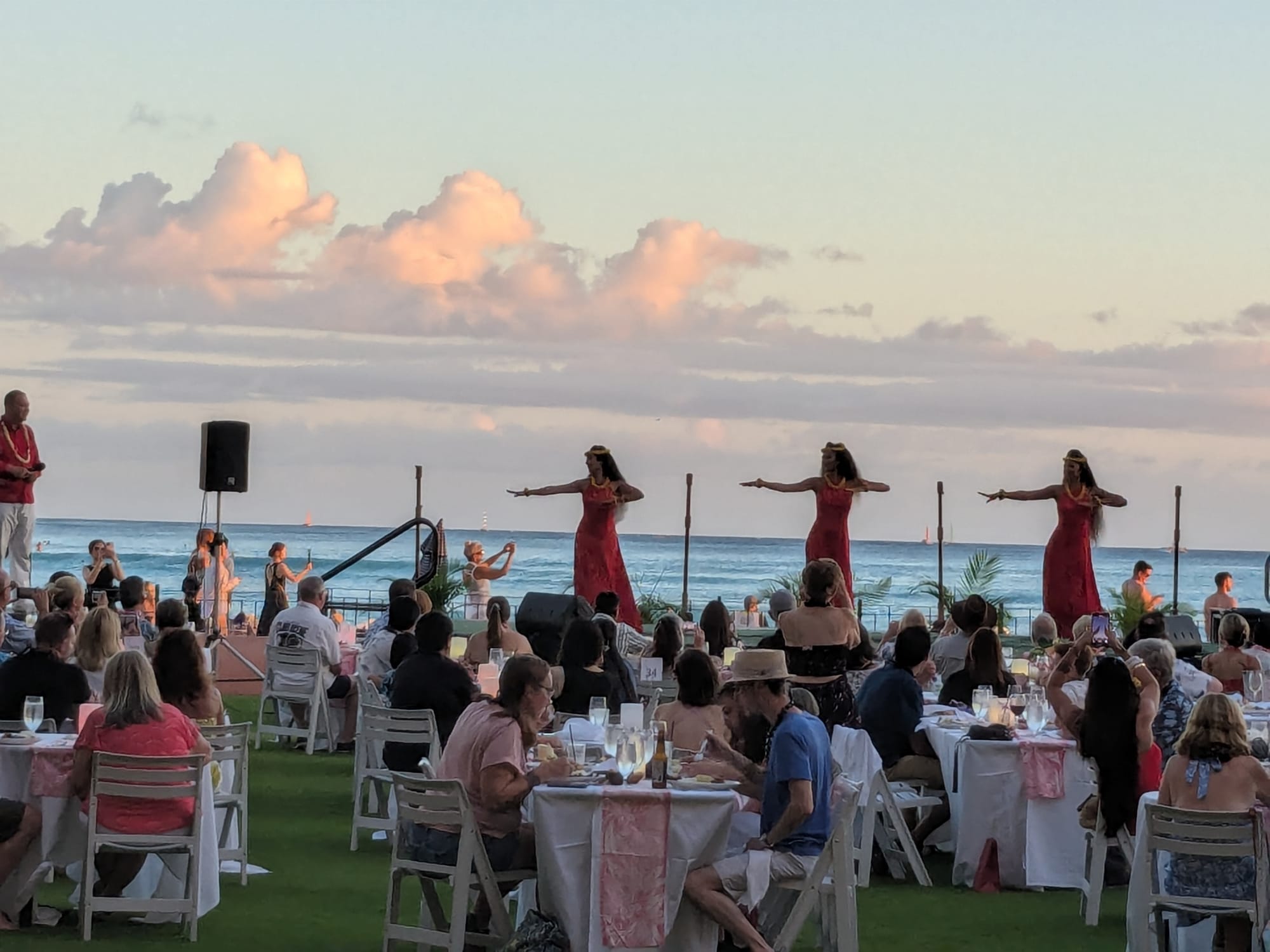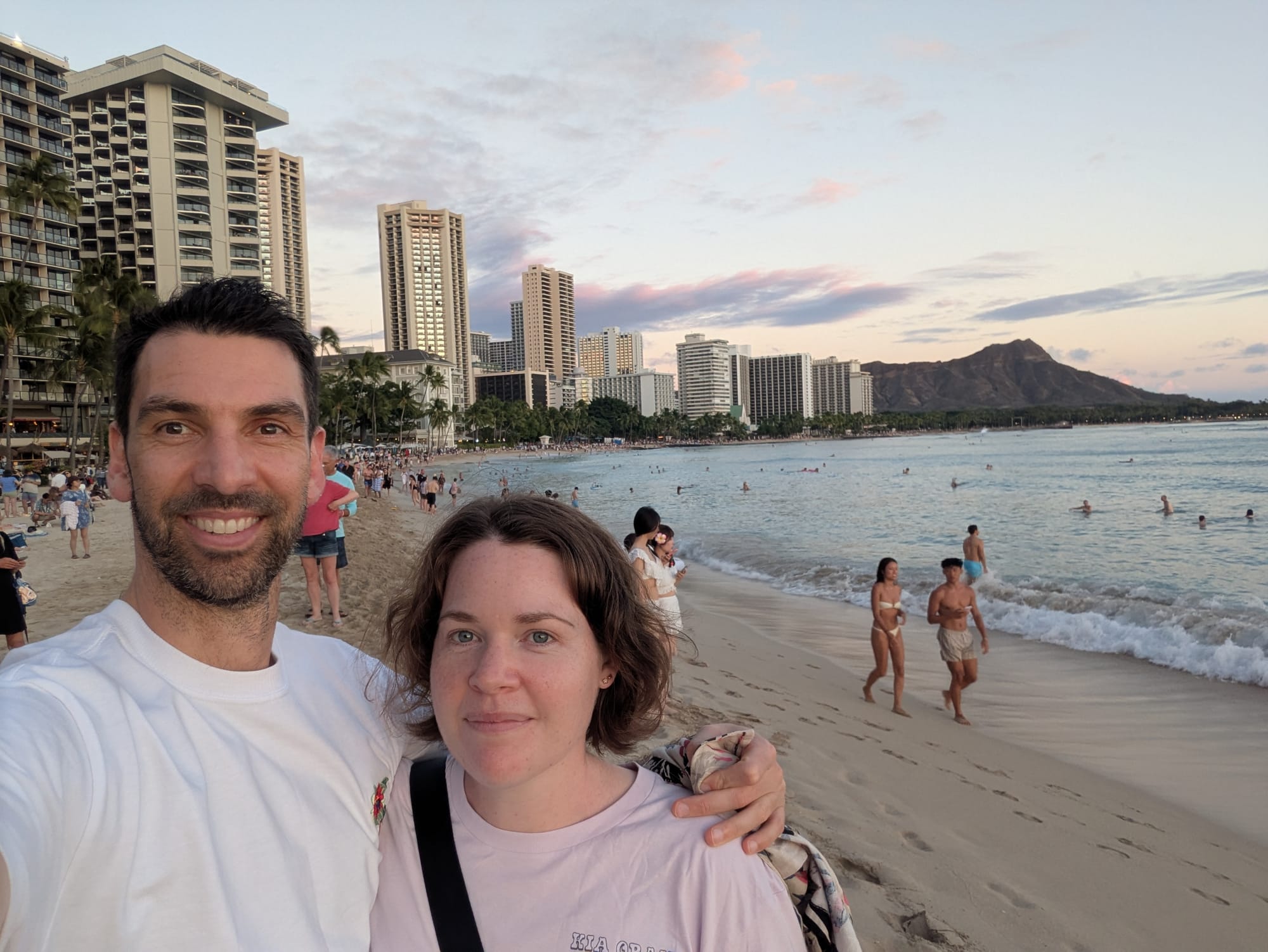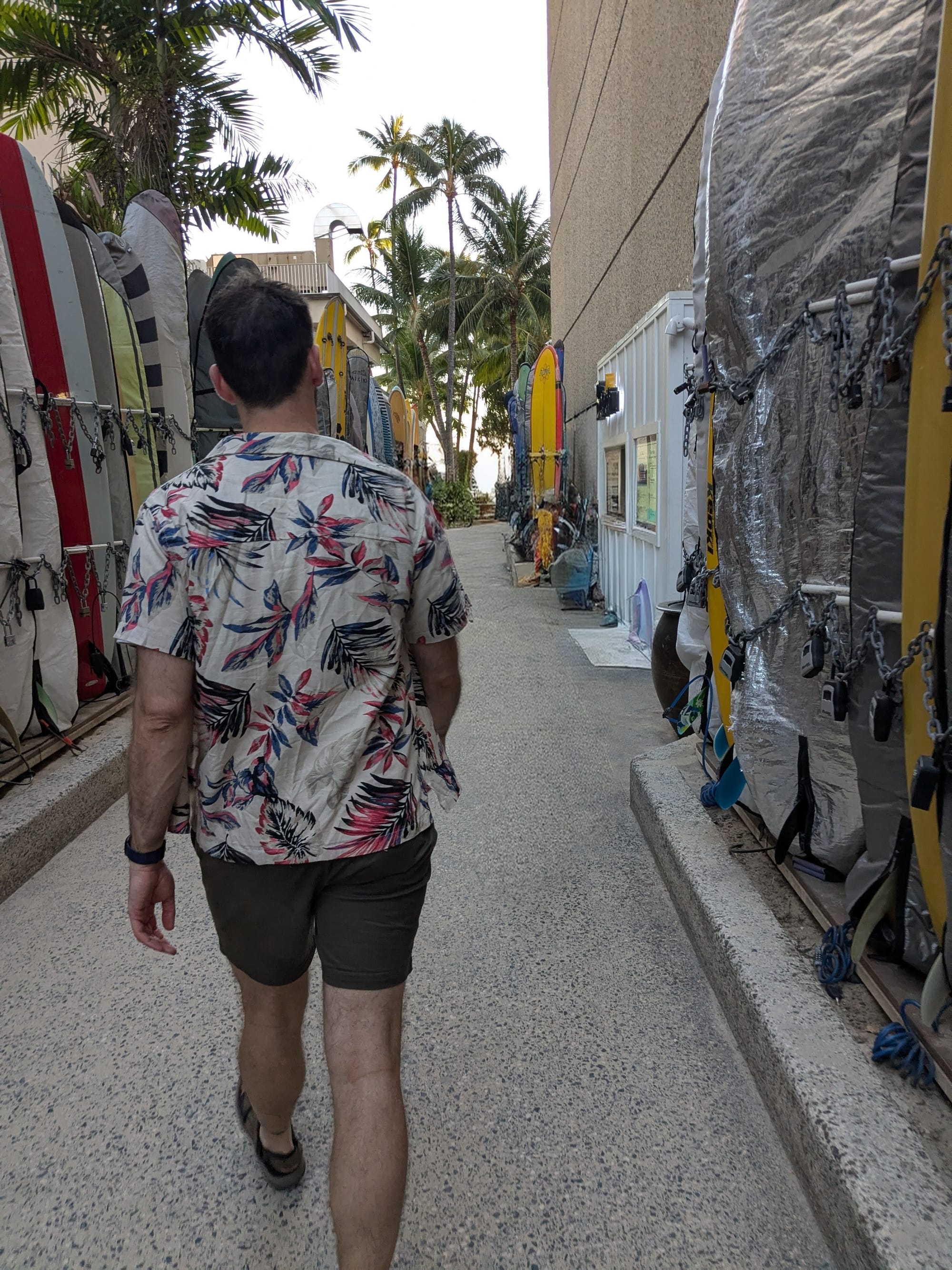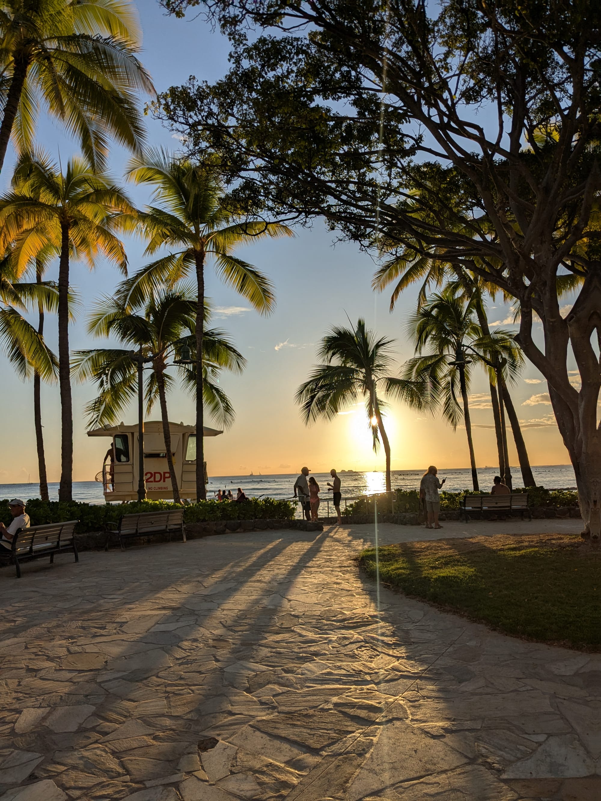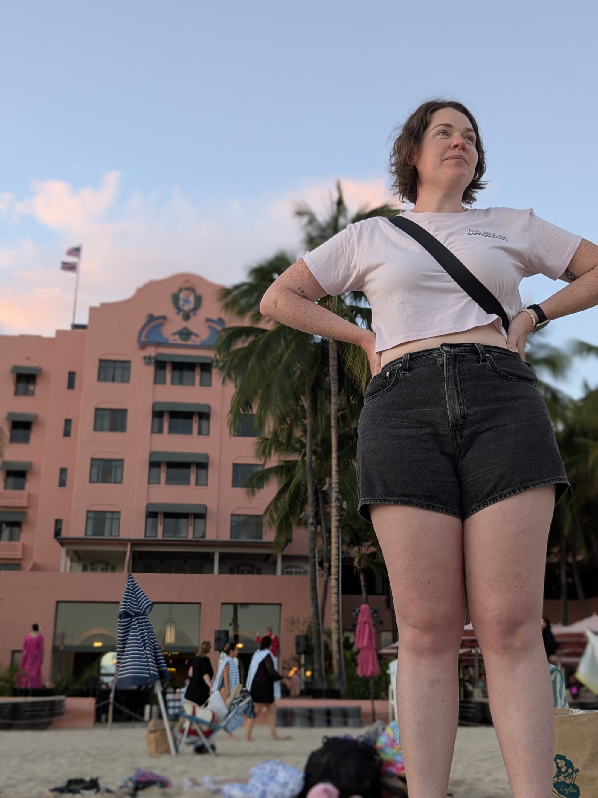 We pull in, have a shower and head out again on foot. We aim for the Royal Hawaain (aka the pink palace). One of the nicer and older looking buildings on the foreshore. It was built by a luxury cruise liner company to give the fancy people who took the liner a fancy place to stay when they arrived from the mainland. It's beautiful. We see a hula show in progress but it's a ticketed event. We try and grab a seat and a cocktail but it's golden hour so the only seats are back from the beach and the cocktails are $40USD. We decide to wander up the beach instead and enjoy the sunset.