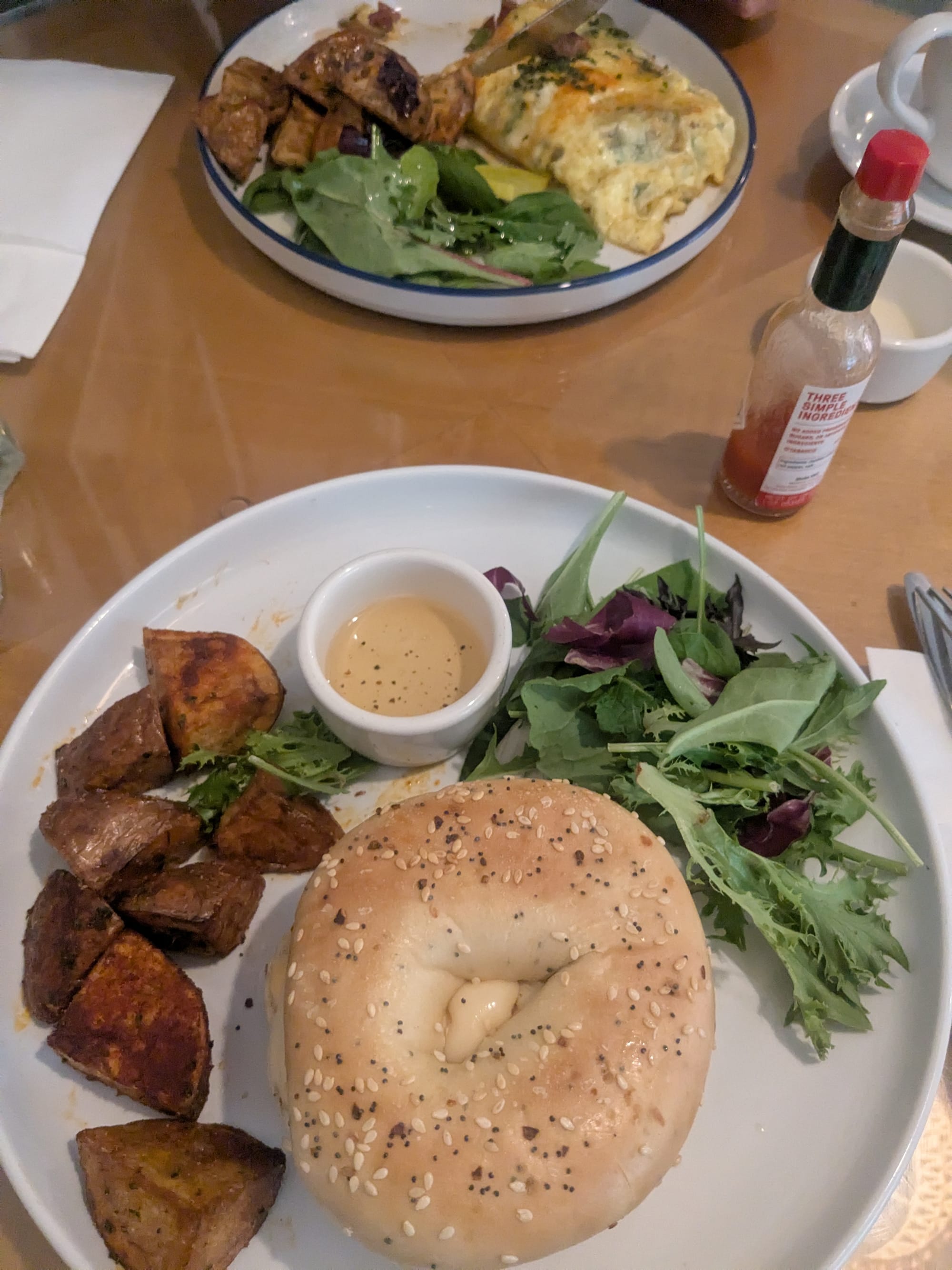 We head home and shower and get ready for some breakfast. We head to "The Brunch Spot" and after a 10 minute wait we're in. Courts gets a bagel, Jeff goes the omelette. Both are fantastic. Some secret sauce magic going on, we think.