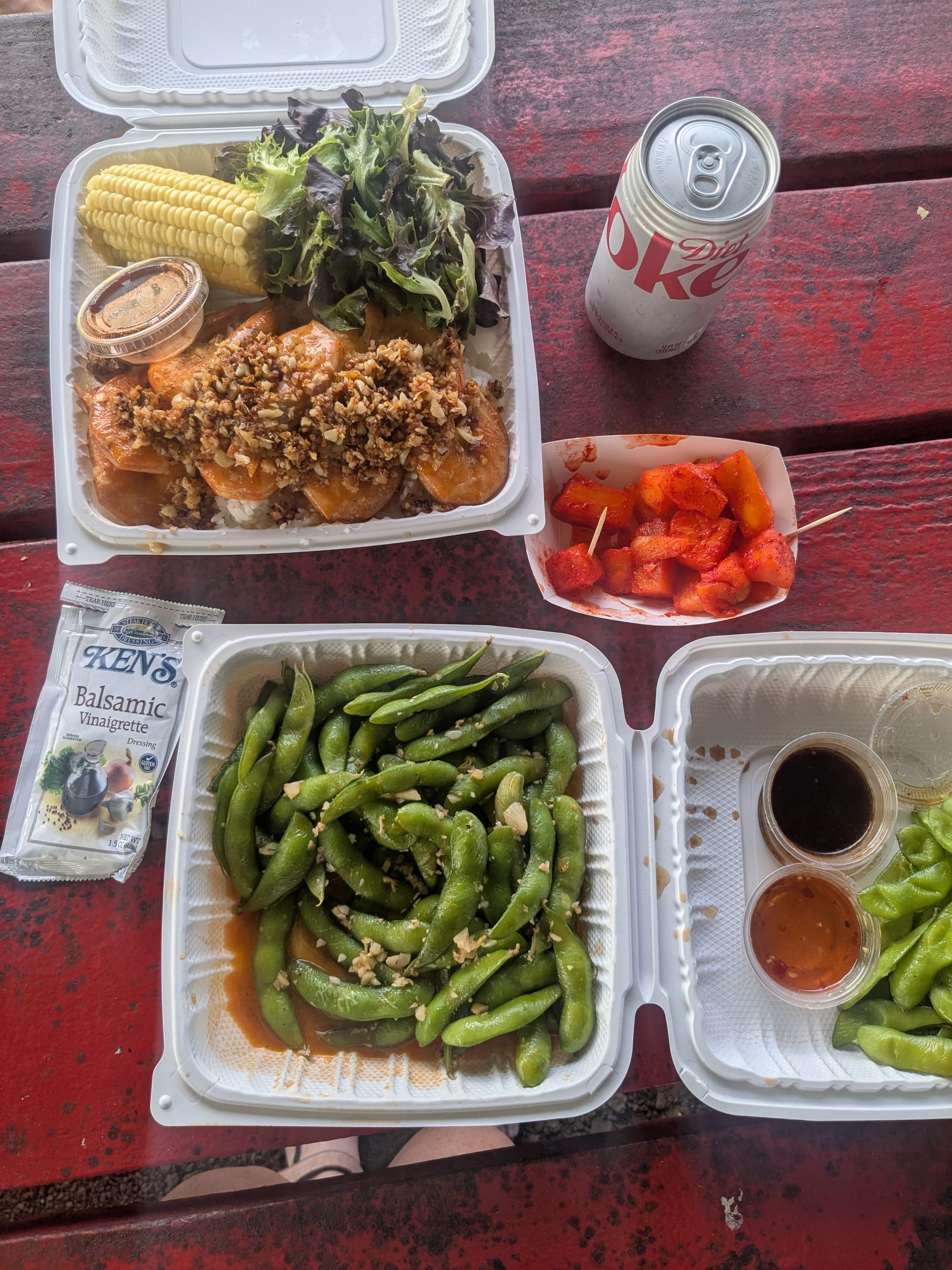 This area is also famous for its shrimp trucks. There's a few to chose from. We end up at the roadside setup of Romy's. We order the house shrimp special with a side of edamame and of course some pineapple (we'd passed the Dole plantation a few miles back).
