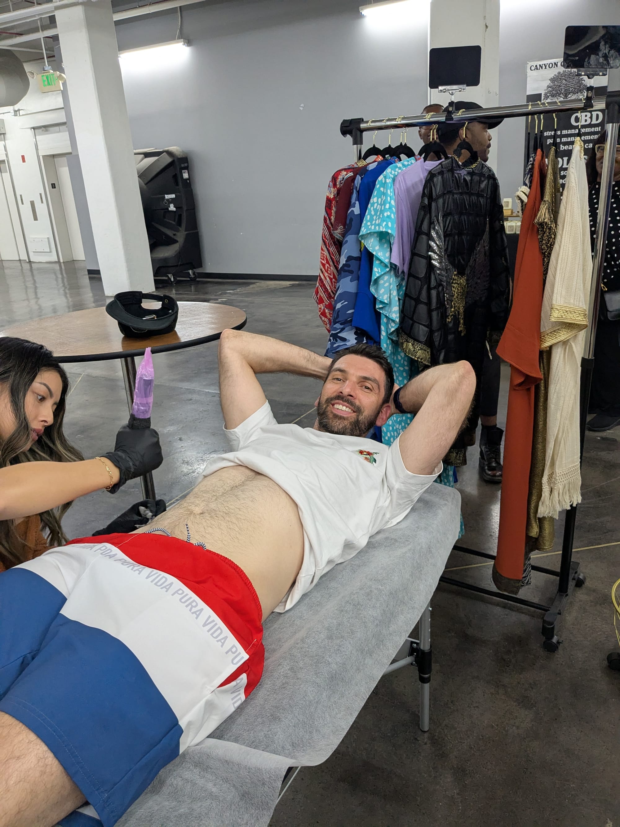 There is also a small market with people selling their products downstairs. There's also a pop-up tattooist, uh oh. A snap decision later and Courts has a baby goat and Jeff has a palm tree.