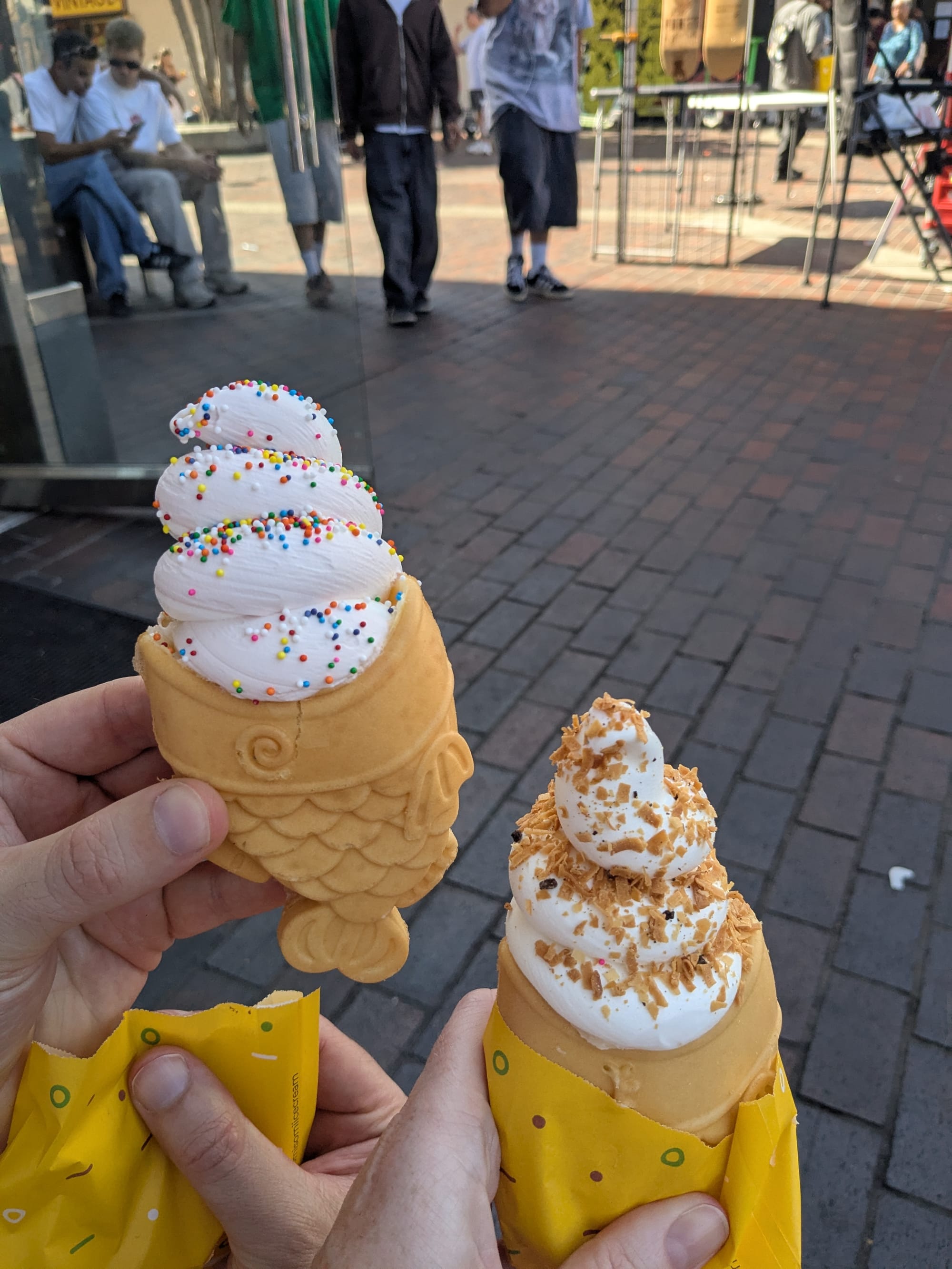 We make it to Little Tokyo via a street which was solely weed outlets. We grab a sweet treat of soft serve in a fish thing the Japanese do. It was brilliant. Courts buys a LA Dodgers/Ghost Face Killer pin.