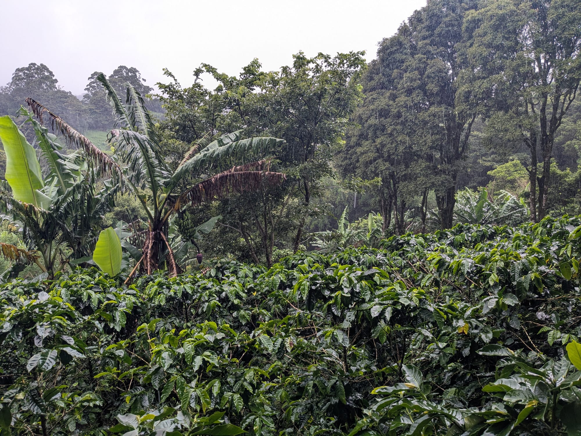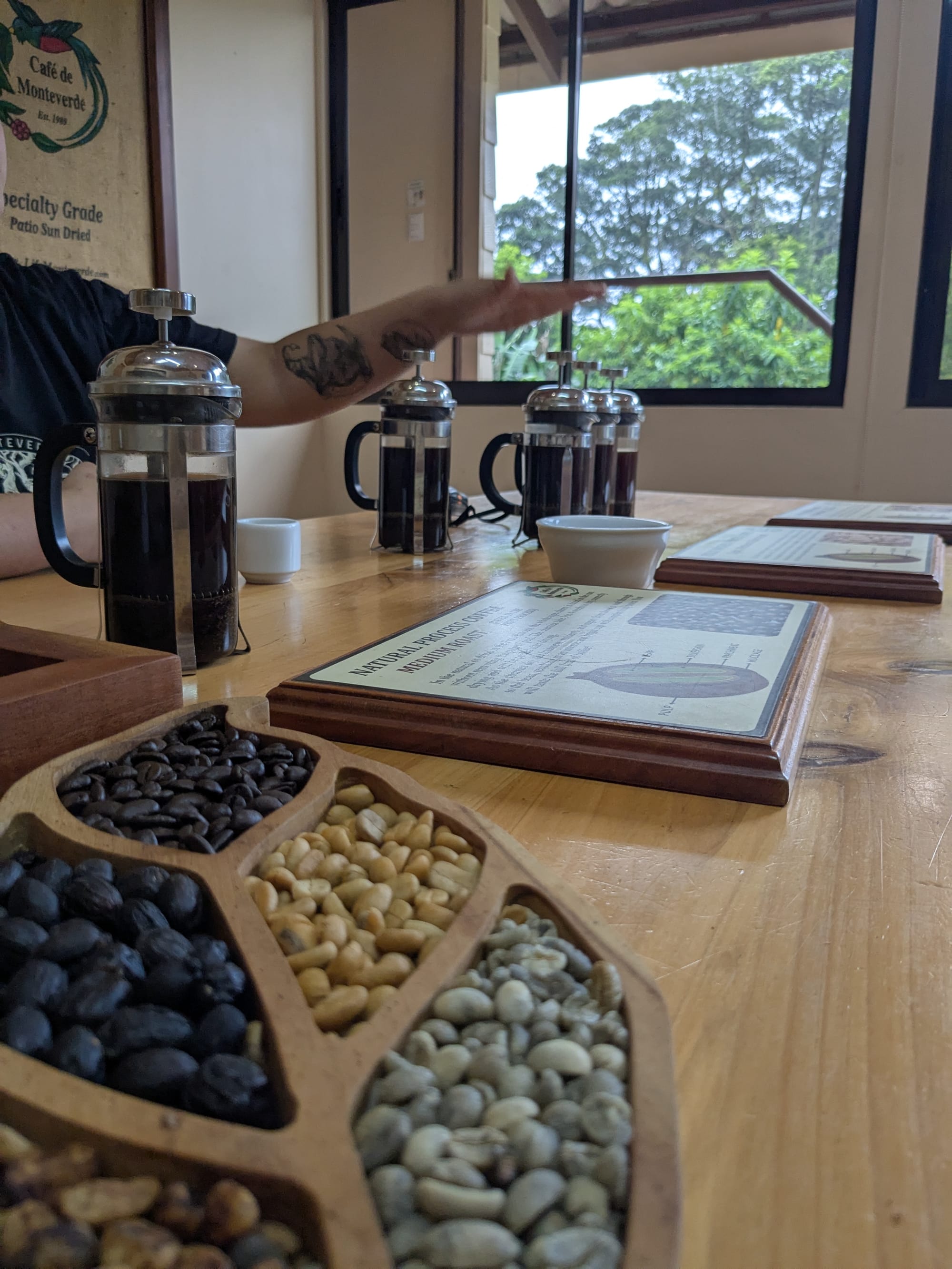 A short drive later and we've arrived at a coffee plantation Cafe Monteverde, for our coffee tour. As soon as we drive in we see rows and rows of coffee plants. We check in with reception, help ourselves to a coffee and a short time later we're on.