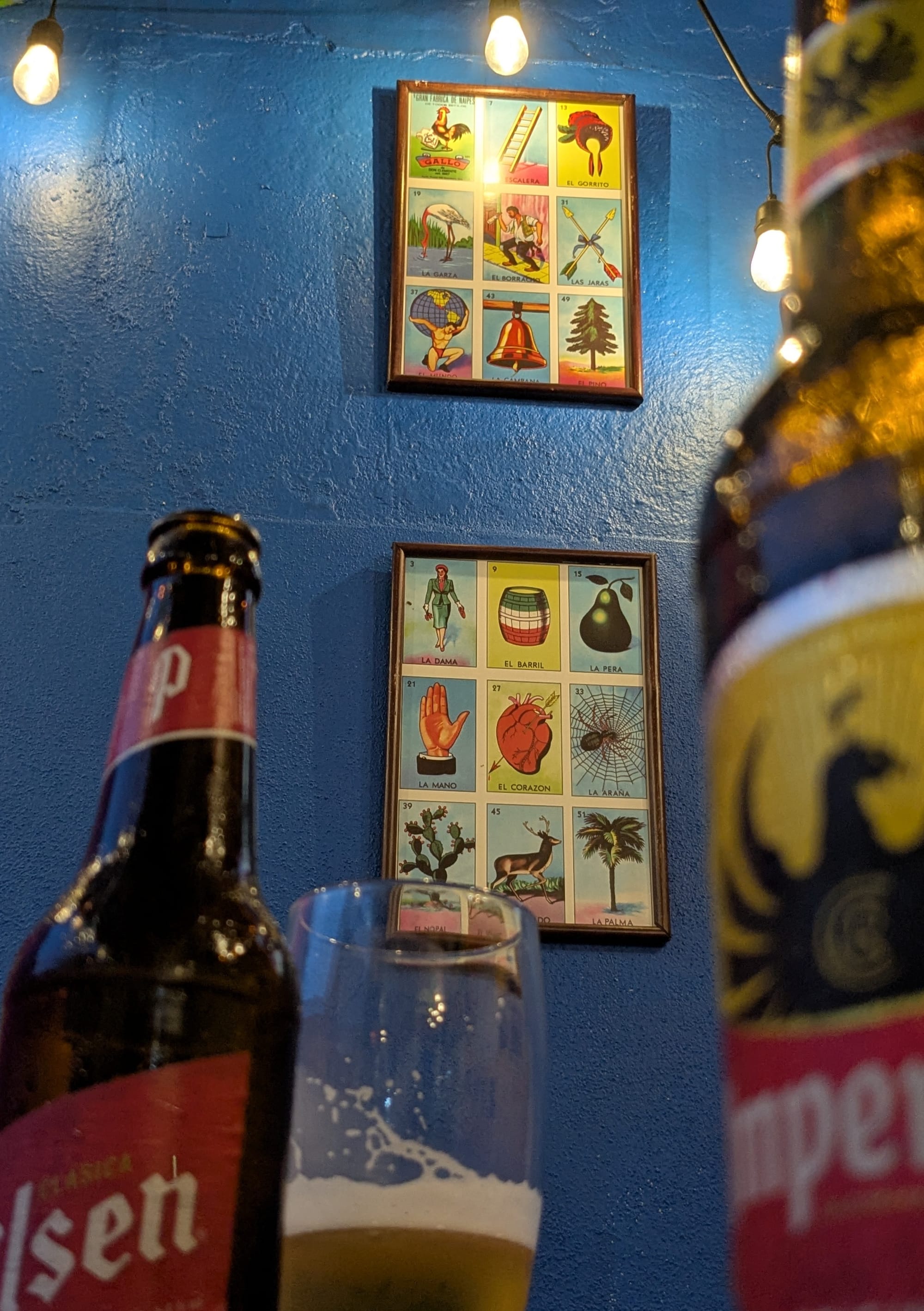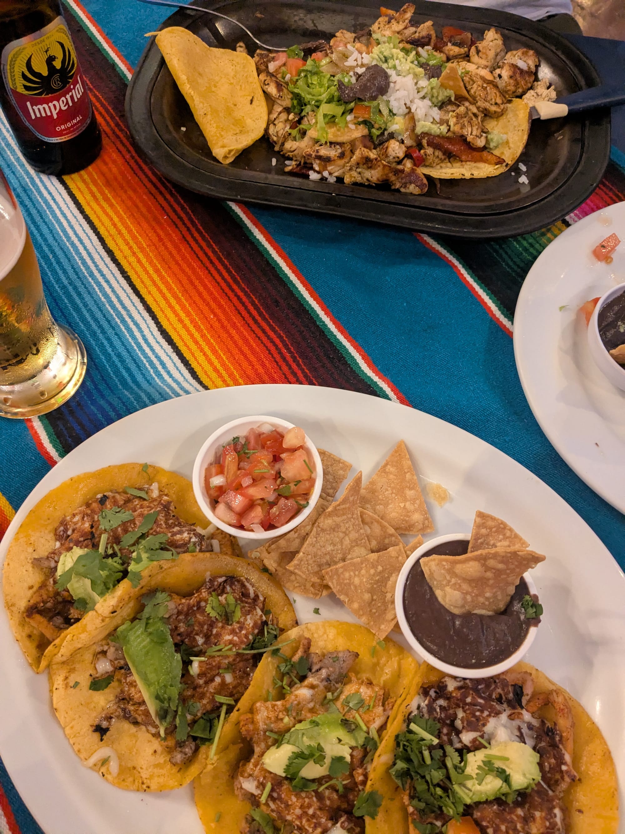 It's a short walk to the recommended restaurant and it doesn't disappoint. It's basically a house with tables scattered throughout and plenty of Mexican decor. We're seated outose which is basically a backyard with some tables and more Mexican decor, with a TV playing a concert of a Mexican singer who has many fans. The food is very authentic and reminds us of dishes we had in Mexico (on a previous trip). Jeff gets fajitas that are served sizzling and Courts goes the tacos, washed down with local beer. It's all delicious and just what the doctor ordered after a day and a half of airport food.