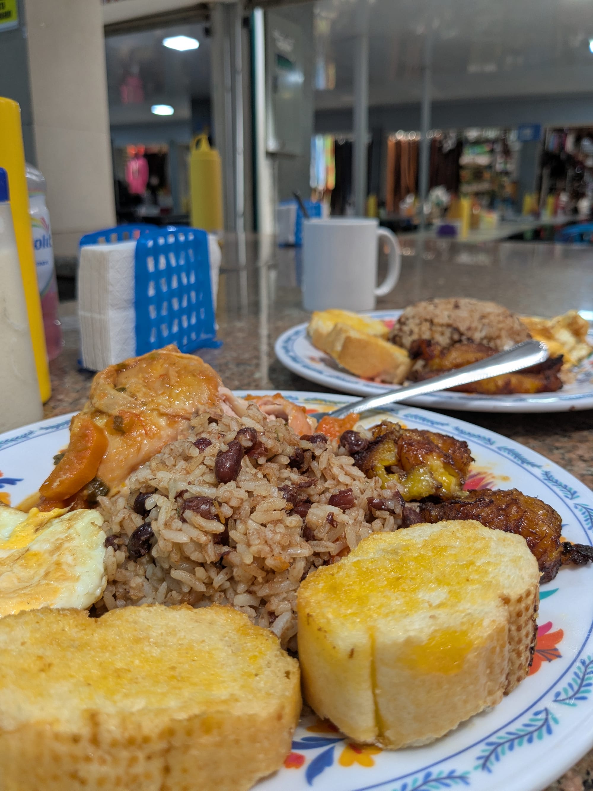 We then wander into the market with breakfast and coffee as the only items on the agenda. We've seen that Costa Rica is famous for its Gallo Pinto at any local Soda (casual diner). It consists of rice and black beans mixed together, some tortillas, fried plantain and some cheese and eggs. We're not 100% sure if we've nailed the order due to the language barrier, but it looks pretty close. It was OK, not brilliant, likewise the coffee.