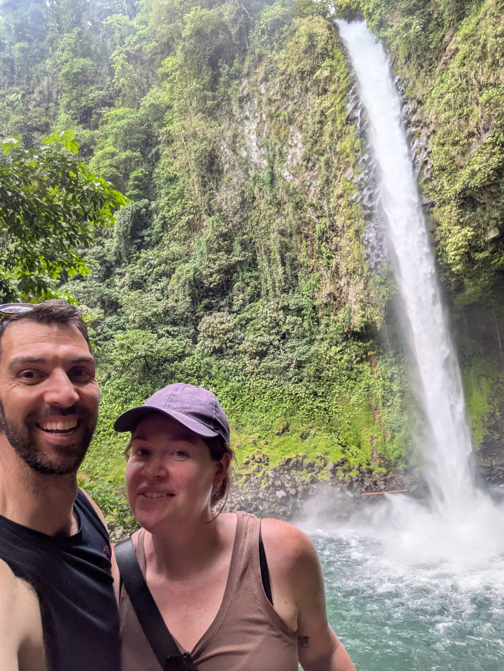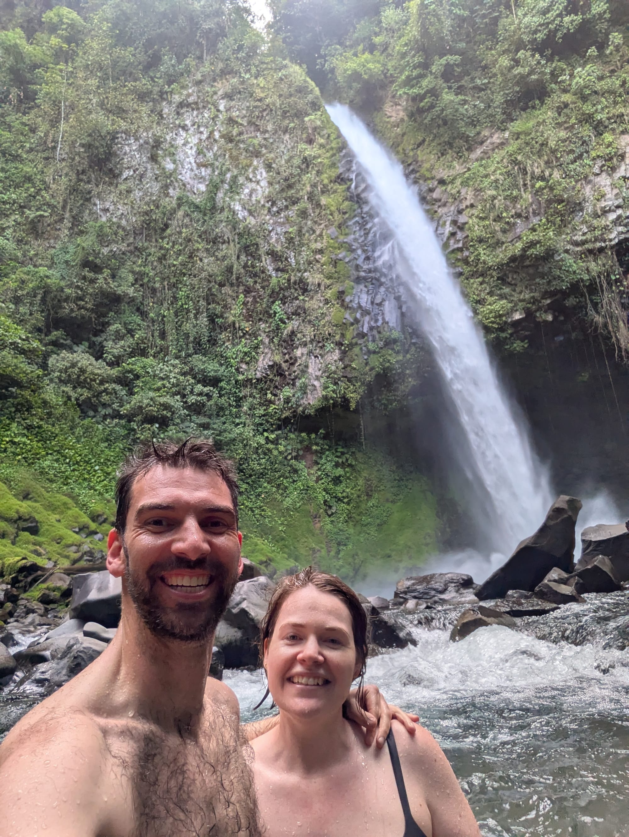 We decide on the La Fortuna Waterfall and within 10 mins we're there. It costs to go in. We're warned it's 500 steps and takes about 15 mins down and 30 back. It's not that bad and soon enough we're stripping off to go for a dip in the little pools of mini rapids. There are signs saying where to go, the people at the front said it's OK to go in today and there are even lifeguards watching.